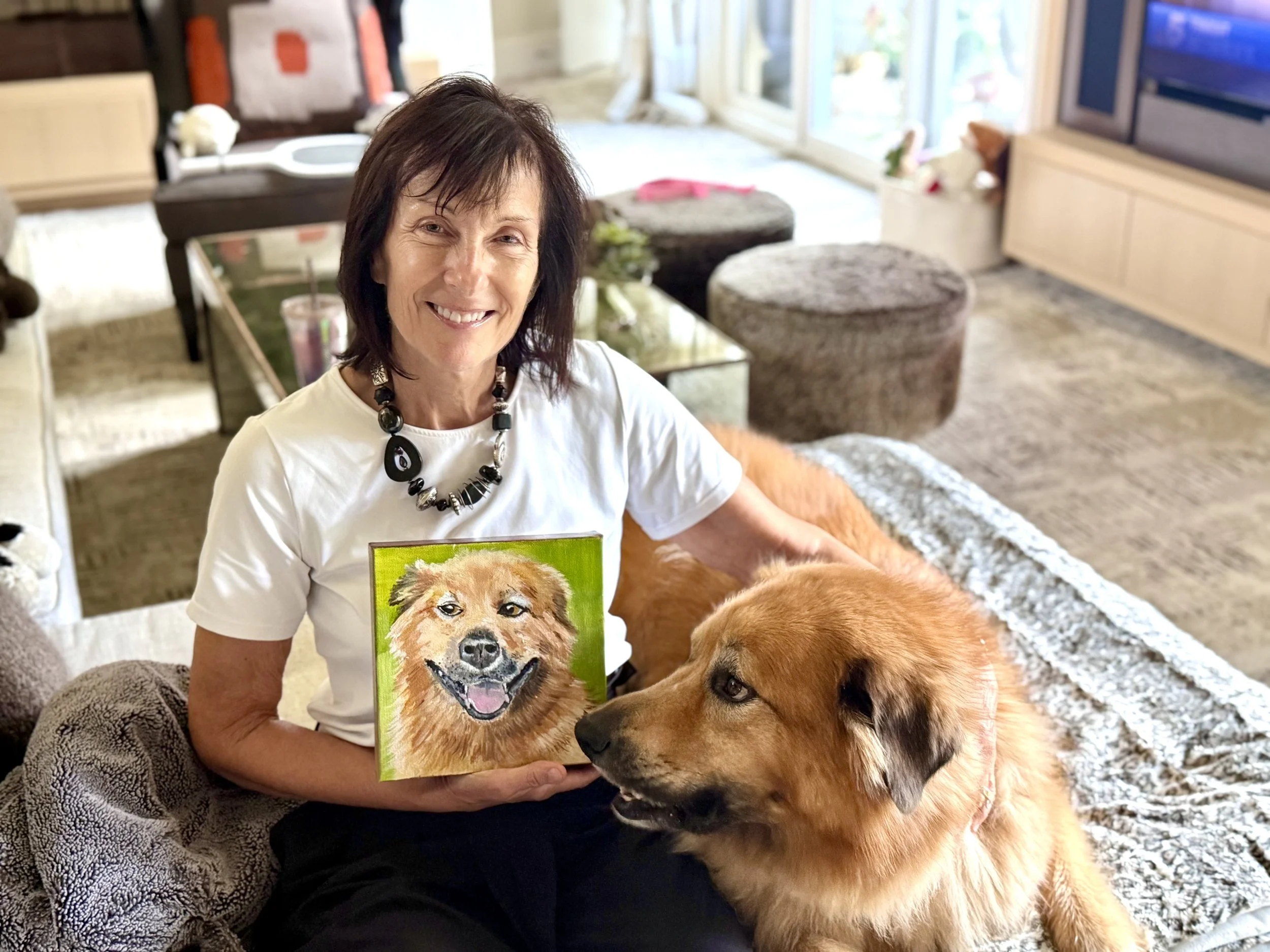 Barbara Carlson of Dallas, Texas enjoys her oil painting of her dog, Teddy.